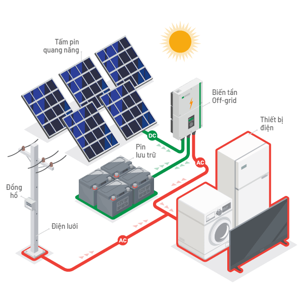 Điện mặt trời độc lập sử dụng pin (ắc quy) lưu trữ, không phát điện ra lưới.