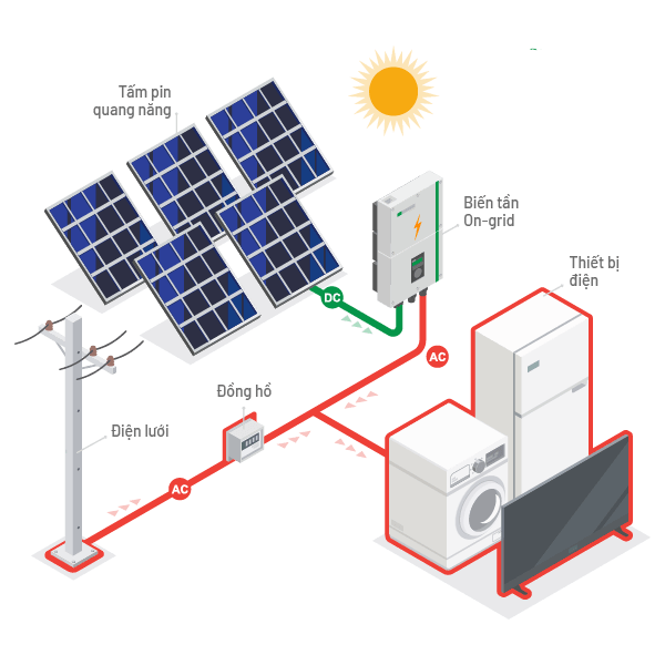 Điện mặt trời hòa lưới, sử dụng được khi có điện lưới, mất điện lưới hệ thống sẽ tự động ngắt.